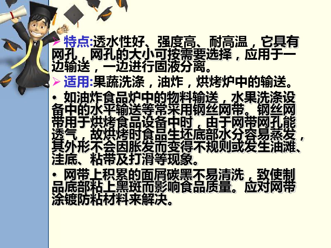 適用:果蔬清洗、油炸、烘烤爐中的輸送。如油炸食品中的物料輸送,水果洗滌設(shè)備中的水平輸送等常采用鋼絲網(wǎng)帶。鋼絲網(wǎng)帶用于烘烤食品設(shè)備中時,由于網(wǎng)帶網(wǎng)孔能透氣,故烘烤食品生胚底部水分容易蒸發(fā),其外形不會因脹發(fā)而變得不規(guī)則或發(fā)生油攤,洼底粘帶及打滑等現(xiàn)象。
