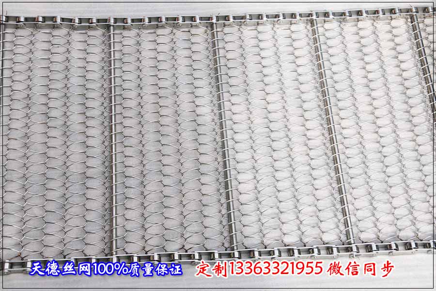 今天上午湖北咸寧客戶來電咨詢鏈條式不銹鋼網(wǎng)帶,用來蒸煮熱干面,干面如同蕨根粉般粗細(xì),在經(jīng)過一番的了解后,定制規(guī)格為: 食品輸送網(wǎng)帶我們采用不銹鋼304材質(zhì),這樣不會(huì)影響食品的質(zhì)量,干凈衛(wèi)生,能夠保證面條的原有鮮味。面條輸送網(wǎng)帶采用的結(jié)構(gòu)形式為鏈條式不銹鋼網(wǎng)帶,鏈條網(wǎng)帶總寬為40公分,長(zhǎng)為20米,每米輸送網(wǎng)帶上面的載重量在10公斤以下,根據(jù)輸送使用絲徑為1.0毫米,根據(jù)輸送面條的大小不銹鋼網(wǎng)帶的孔定制為5*10毫米,不銹鋼鏈條網(wǎng)帶的節(jié)距為25.4毫米,不銹鋼圓棒支撐桿直徑為6毫米,圓棒之間的間距為150毫米,材質(zhì)選用全部304不銹鋼。